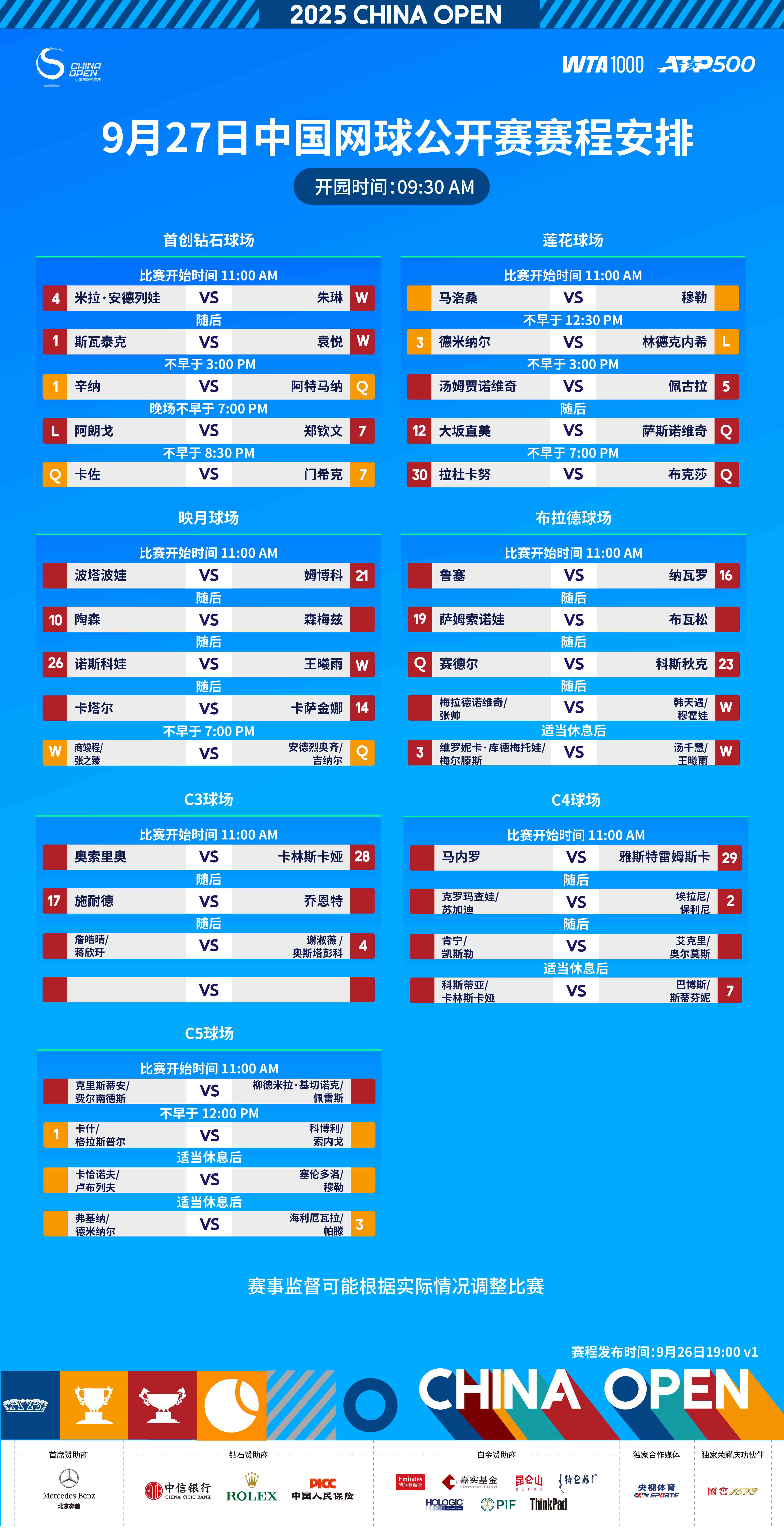 9月27日,2025中国网球公开赛将继续男女单打第二轮的争夺,女单方面,郑钦文即将坐镇夜场,迎来今年中国赛季首秀,斯瓦泰克、大坂直美、拉杜卡努等人气选手也将出战;男单方面,辛纳领衔多位种子选手向八强发起冲击。