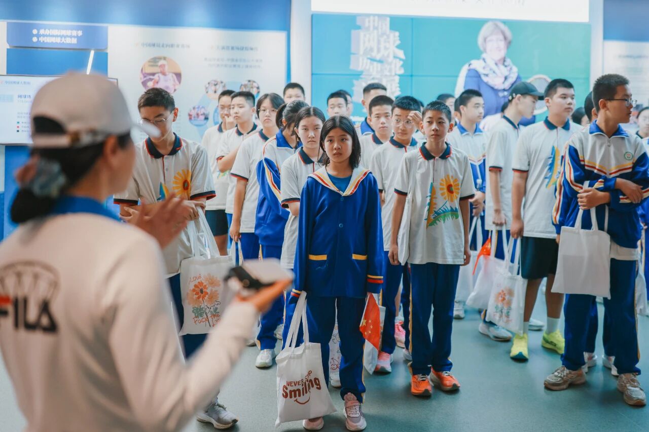 除了体验网球乐趣,同学们还参观了中国网球历史文化巡展。在讲解员的引导下,他们通过图文与实物回顾了中国网球从筚路蓝缕到蓬勃发展的历程。站在中网“冠军手印”墙前,孩子们与网球明星隔空击掌,完成了一次无声而有力的对话。冠军背后的坚持与拼搏,也在他们心中悄然埋下梦想的种子。紧接着,中网志愿者详细介绍了网球计分规则、观赛礼仪等网球知识,在互动竞答环节更是激发了孩子们对网球的浓厚兴趣,他们积极参与,争相抢答,对网球的热爱也在心中悄悄萌芽。