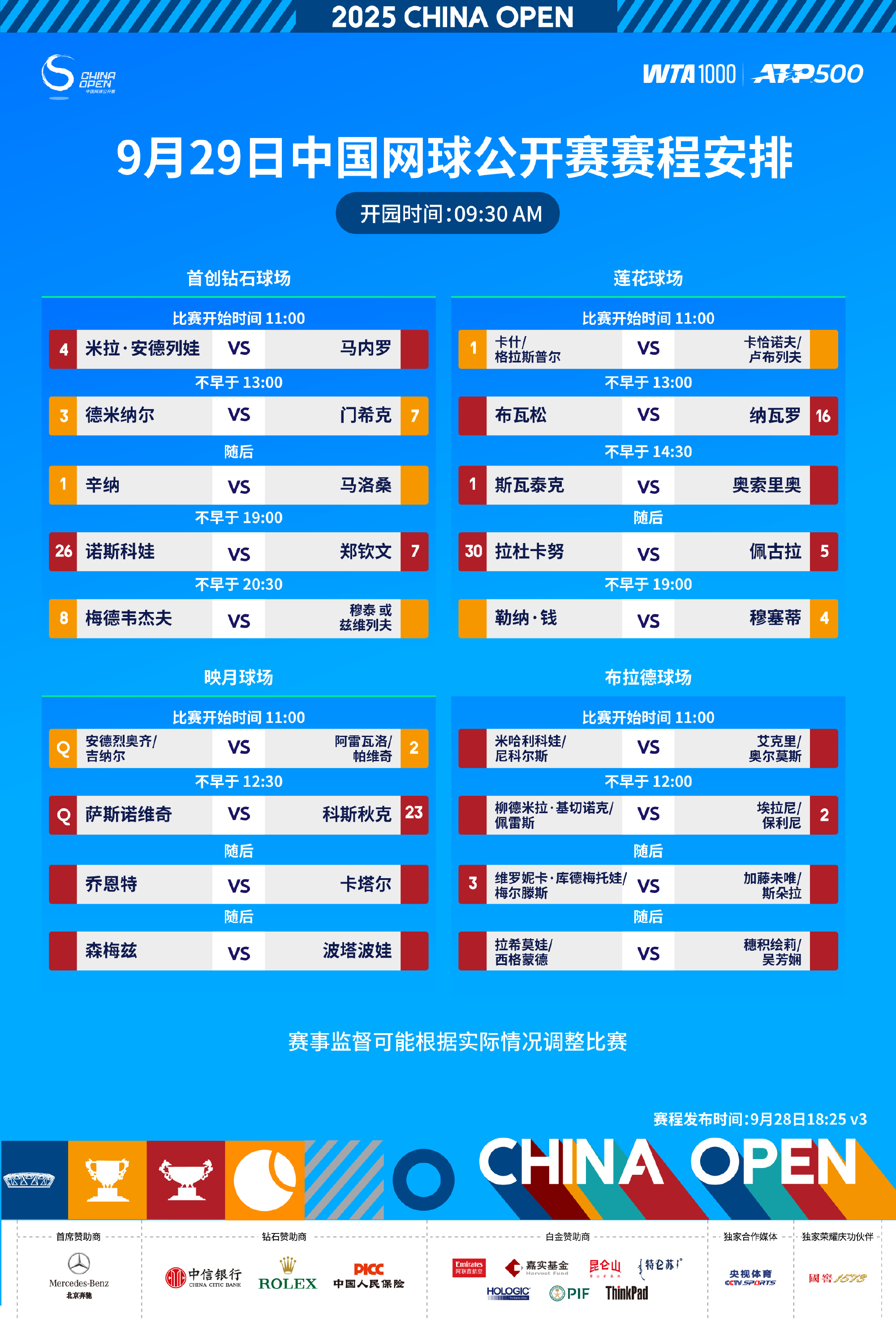 9月29日,2025中国网球公开赛将继续女单第三轮的争夺,郑钦文、斯瓦泰克、拉杜卡努等都将向16强发起冲击;男单四分之一决赛将全面开打,兹维列夫和梅德韦杰夫上演焦点之战,辛纳也将出战。