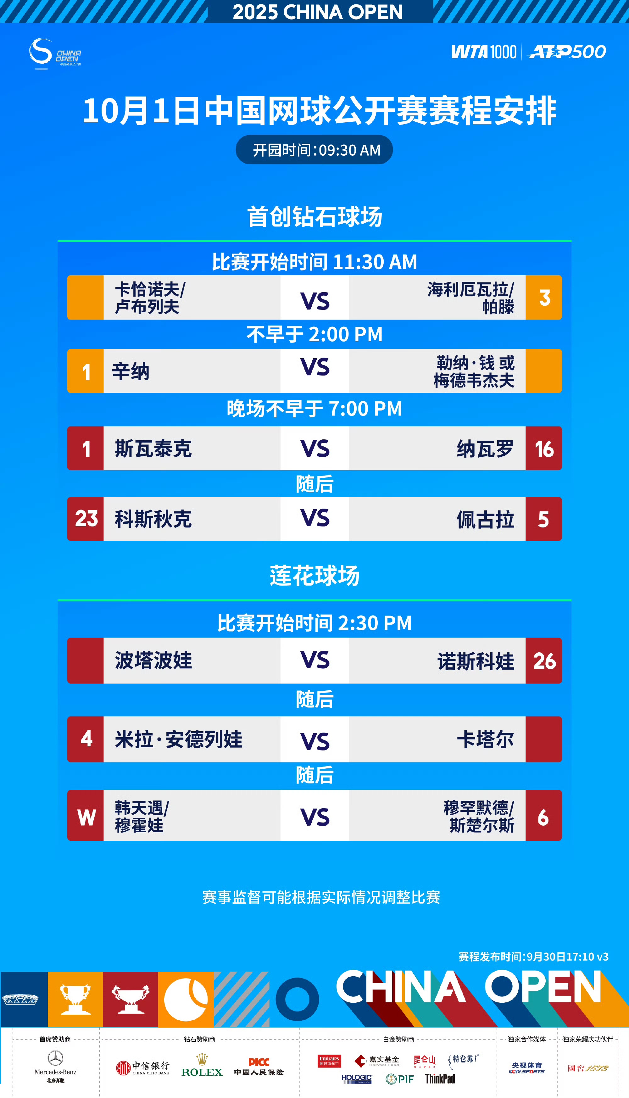 10月1日,2025中国网球公开赛将迎来男单、男双决赛的争夺。另外,女单上半区第四轮也将开打,斯瓦泰克、佩古拉、米拉·安德列娃等前十球员将向八强发起冲击。
