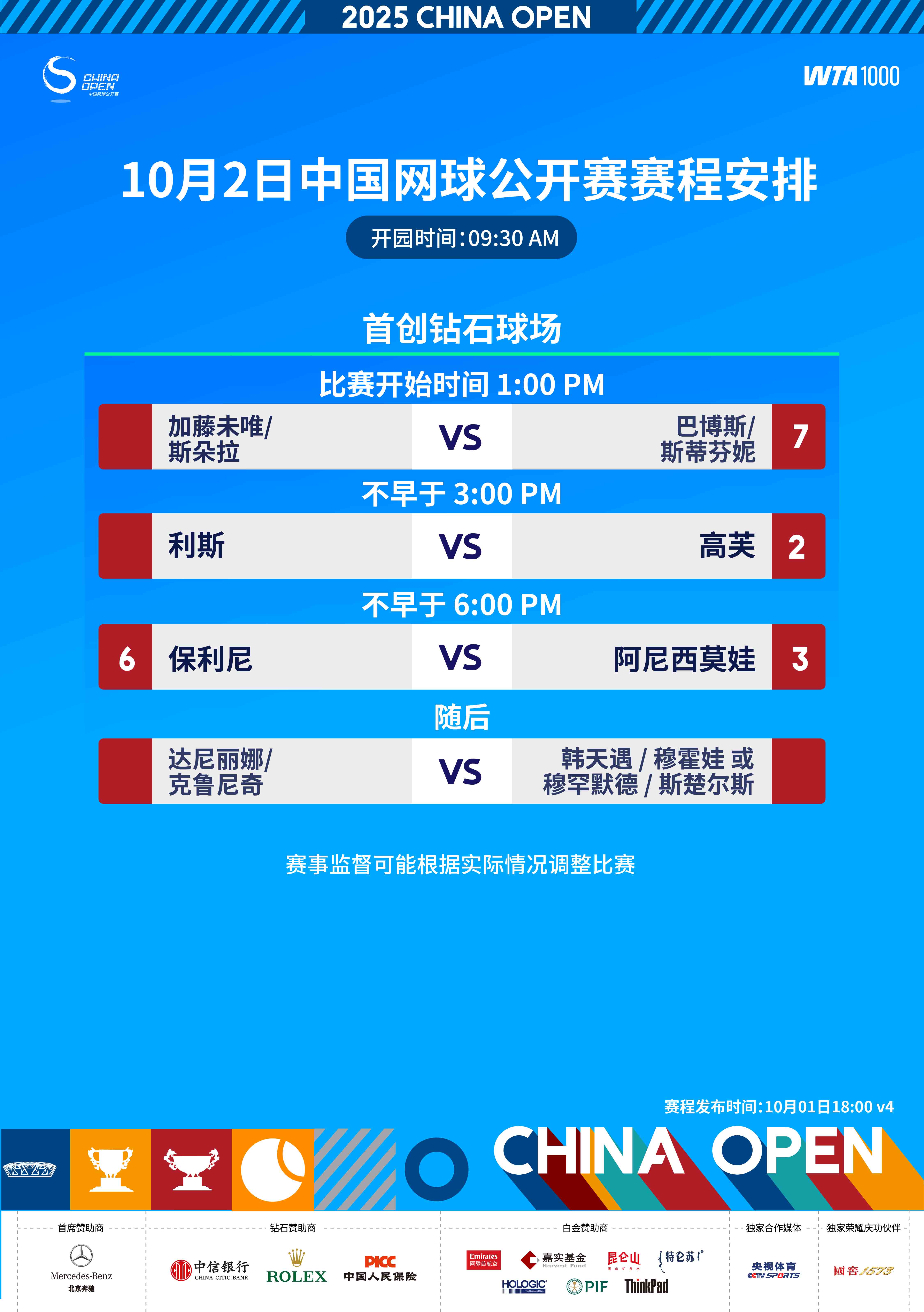 10月2日,2025中国网球公开赛将展开女单下半区、女双上半区四分之一决赛的争夺,三位世界前十高芙、阿尼西莫娃、保利尼携手出战!