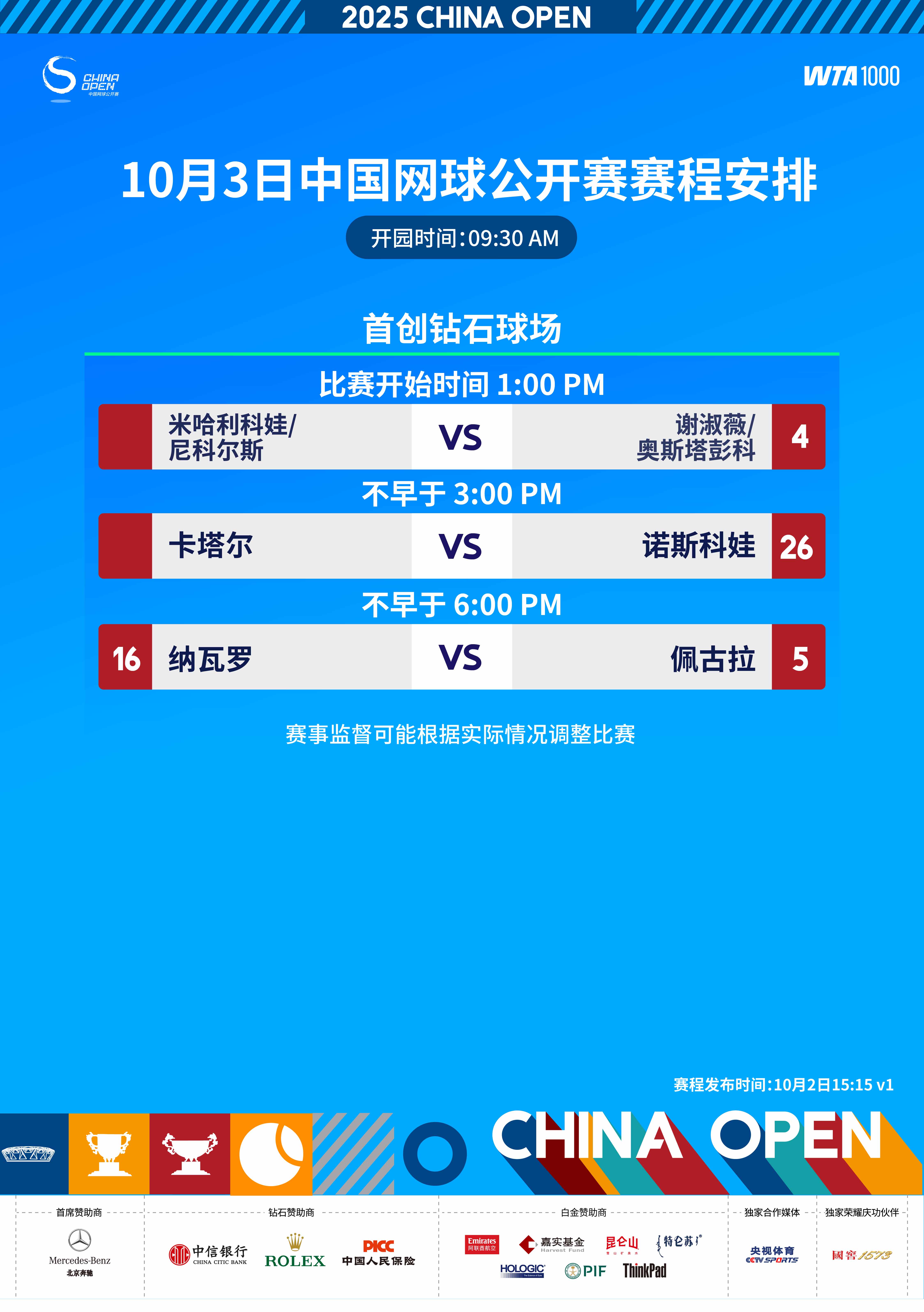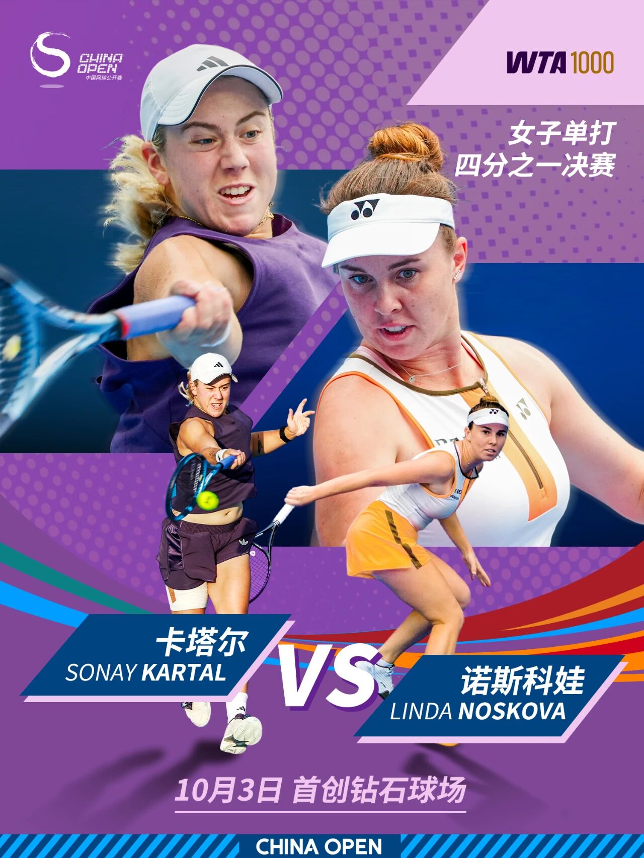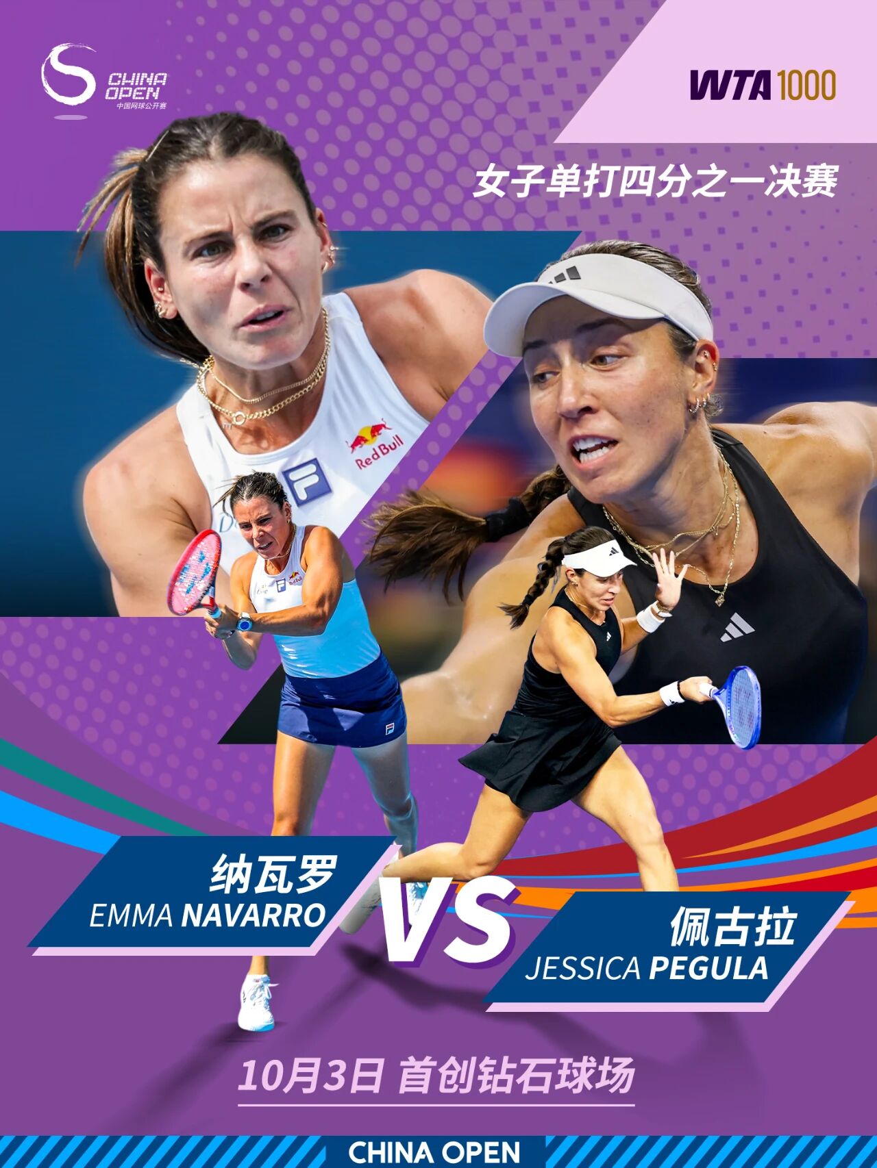 10月3日,2025中国网球公开赛将继续女单、女双四分之一决赛的争夺。女单方面,两位美国名将佩古拉、纳瓦罗将上演一场焦点之战;另一场比赛,诺斯科娃和卡塔尔都将向生涯首个WTA1000赛四强发起冲击。