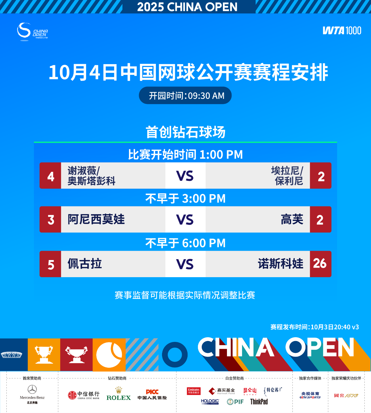 高芙、阿尼西莫娃巅峰对决10月4日,2025中国网球公开赛进入倒数第二个比赛日的争夺,女单、女双半决赛将轮番上演,女单四强中有三位美国选手,其中高芙和阿尼西莫娃将上演一场美国德比,佩古拉则要迎战大黑马诺斯科娃。女双半决赛,埃拉尼/保利尼迎战谢淑薇/奥斯塔彭科同样看点十足。