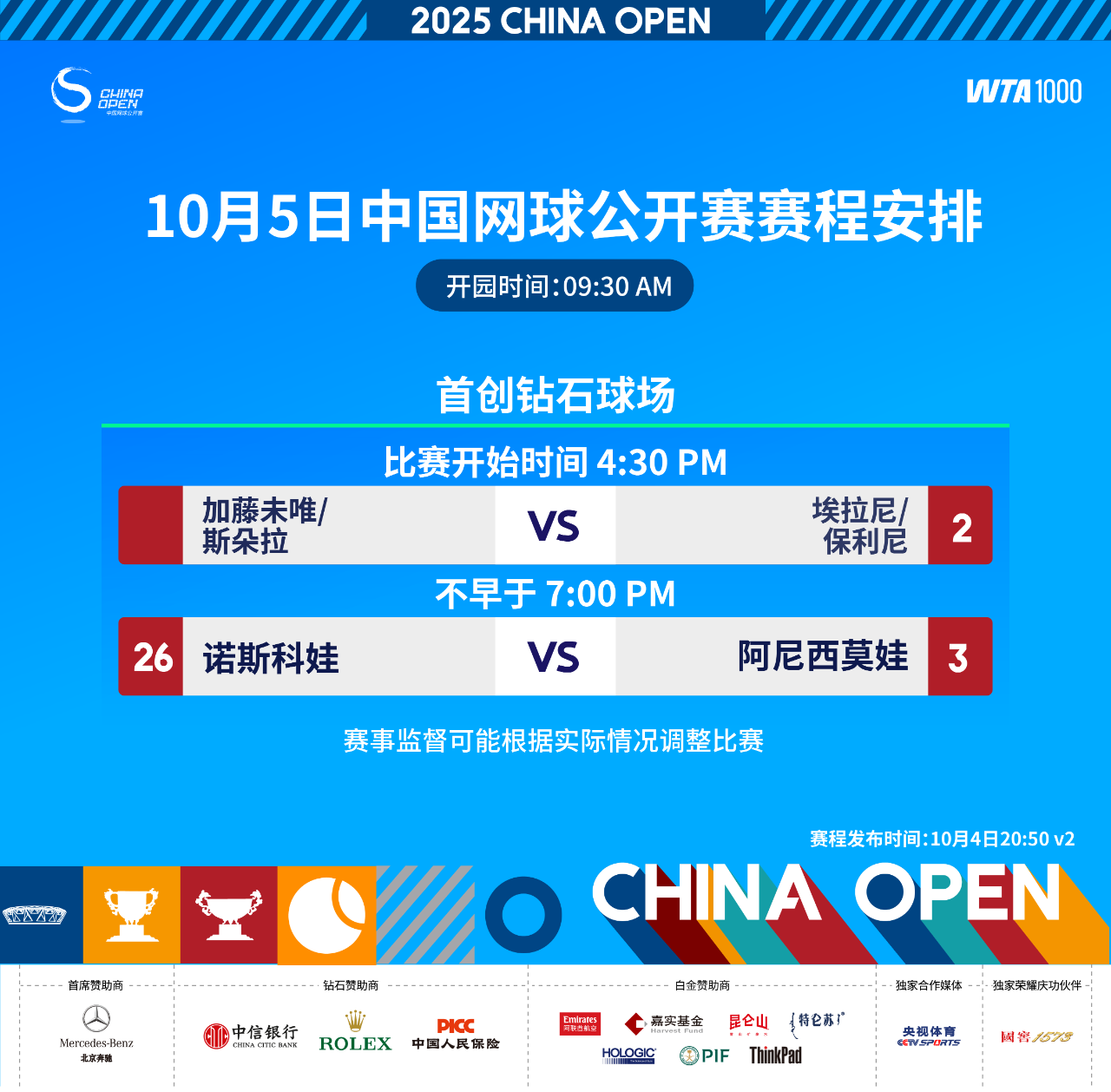 10月5日,2025中国网球公开赛进入收官之日,女双、女单决赛依次上演,保利尼/埃拉尼力争成为中网历史上首对成功卫冕的女双组合,阿尼西莫娃则将向个人首个中网冠军、第二座1000赛冠军发起冲击,若能成功,她的世界排名将首次升至第三。