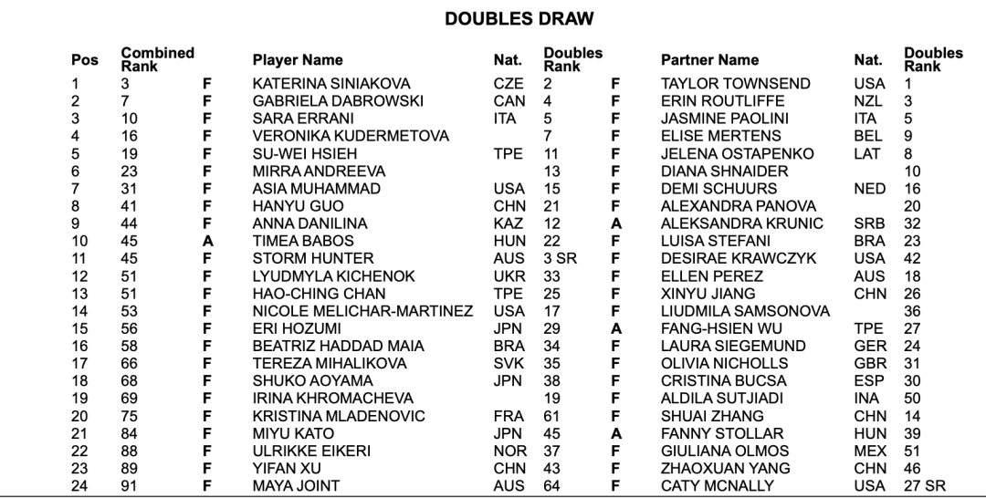 2025中国网球公开赛女子双打阵容正式出炉!世界第一组合、2025澳网女双冠军西尼亚科娃/汤森德,卫冕冠军、2025法网女双冠军埃拉尼/保利尼,2025温网女双冠军维罗妮卡·库德梅托娃/梅尔滕斯,2025美网女双冠军达布劳斯基/卢特利芙等24对组合入围女双正赛。