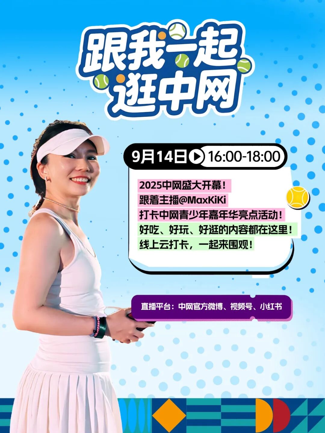 9月14日16:00-18:00,阿中将邀请主播@MaxKiKi共同开启《跟我一起逛中网》的第一场直播,带大家云打卡,感受现场新鲜玩法!