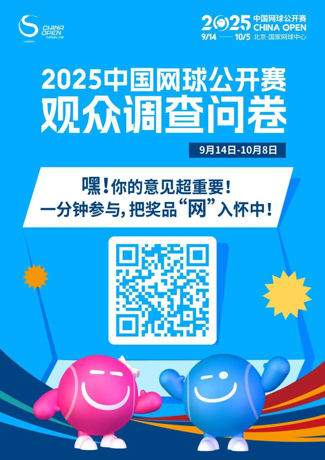 2025 中网的每一份精彩,都离不开您的呐喊与陪伴;而未来中网的每一次升级,更需要您的真知灼见指引方向!现诚邀您参与「2025 中网观众满意度调研」,扫描二维码即可畅所欲言,更有惊喜福利等候 —— 完成问卷即可参与抽奖,赢取中网官方纪念品,让这份赛场记忆与您长久相伴!