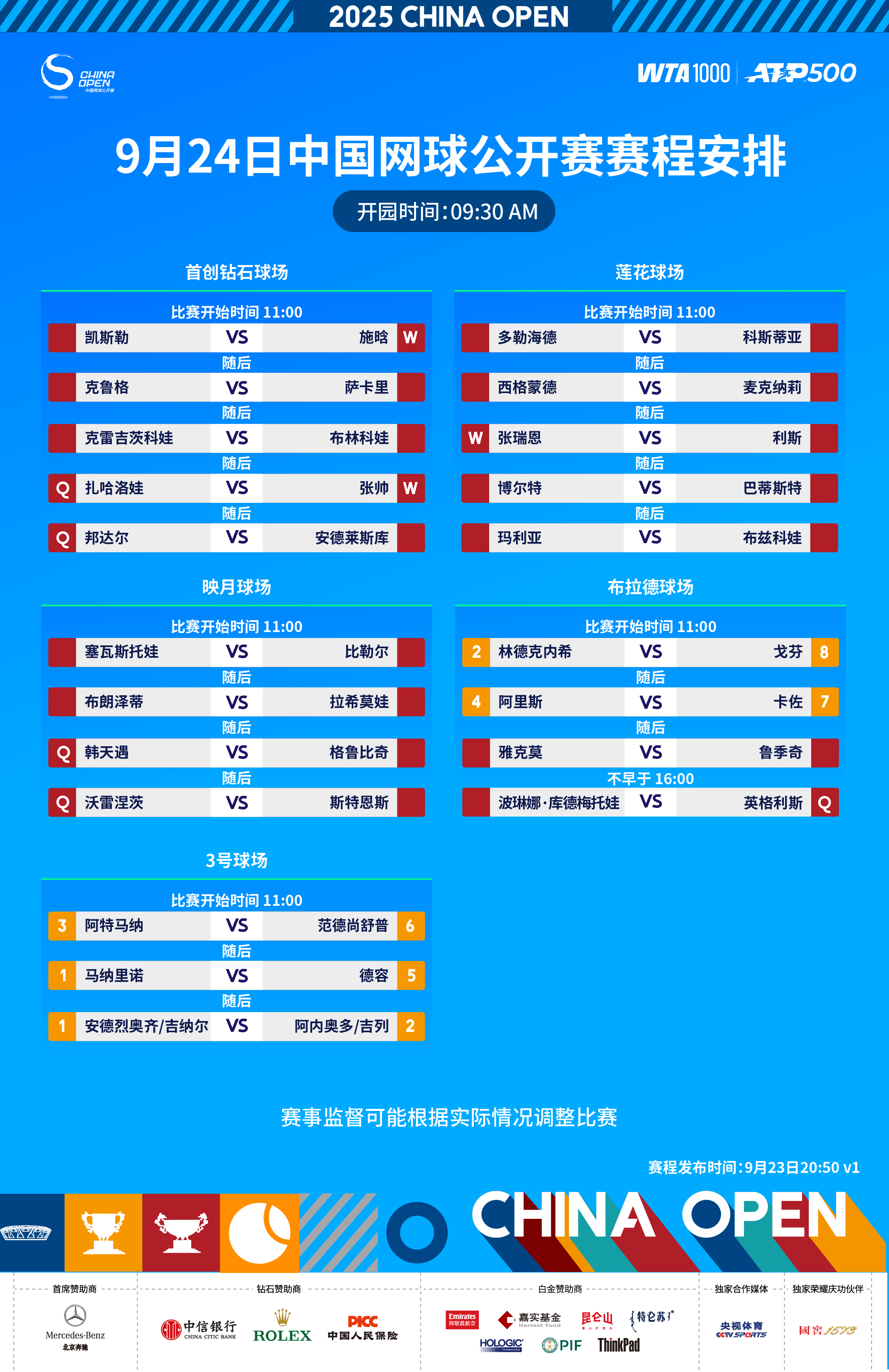 9月24日,2025中国网球公开赛将展开男单资格赛决胜轮、女单正赛首轮的争夺。女单方面,张帅、施晗、张瑞恩三位中国金花出战,两位大满贯冠军克雷吉茨科娃、安德莱斯库也将登场亮相。