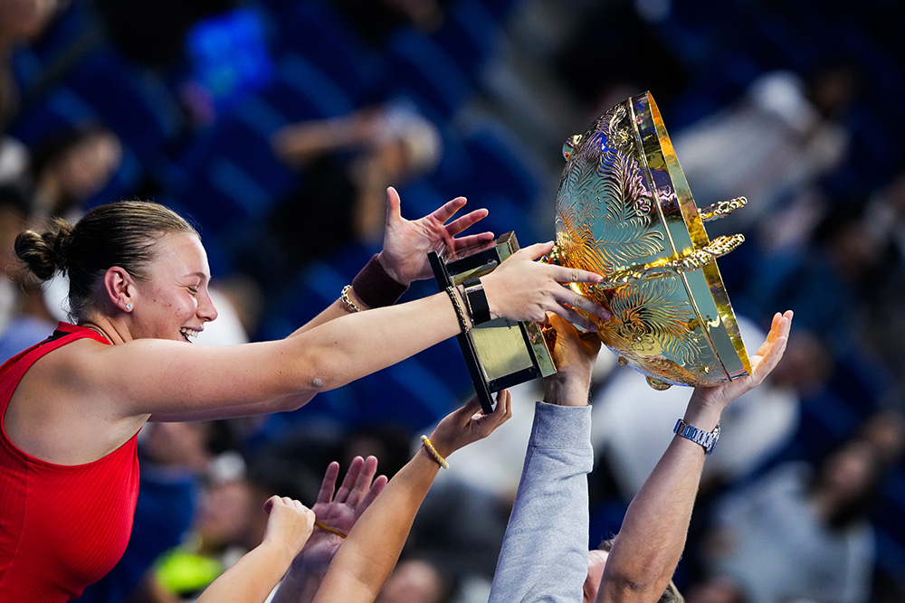 Amanda Anisimova lifts the 2025 China Open Women’s Singles trophy with her team on Sunday, Oct. 5. The 24-year-old American won the championship by defeating Linda Noskova 6-0, 2-6, 6-2.
