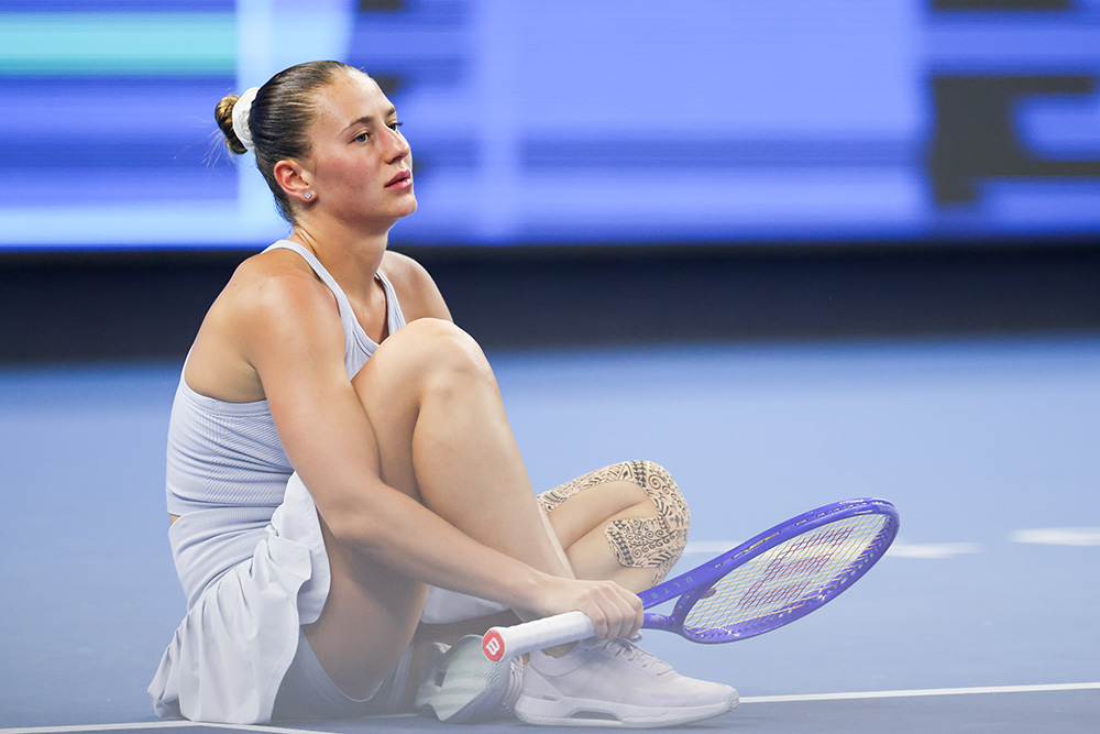 No. 23 seed Marta Kostyuk sits on the court after a point during her Round of 16 match against Jessica Pegula on Wednesday, Oct. 1. Kostyuk lost the match 6-3, 6-7(4), 6-1.