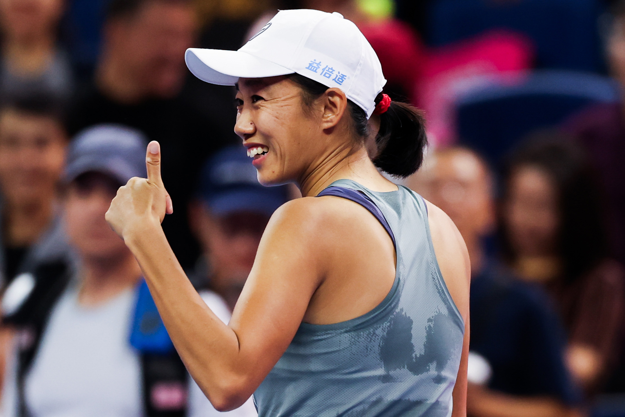 Zhang Shuai gives a thumbs up after her second round win against Wang Xinyu on Friday, Sept. 26. The 36-year-old Chinese wild card won the match 6-4, 6-2, but lost in the third round to Amanda Anisimova.
